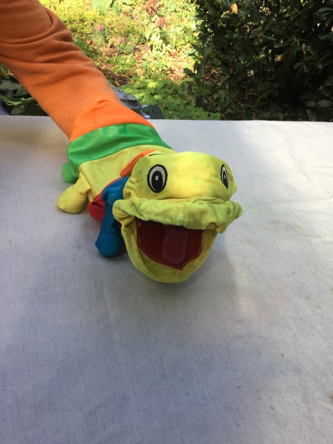 Grub (above). Grub was one of the simplest puppet characters, made from a toy caterpillar bought second-hand, with stuffing taken out, a hand-hole for the puppeteer made and the mouth cut open with a moving jaw, made from a folded cardboard disc, put in. Fingers of pink woolen gloves make very good tongues.
